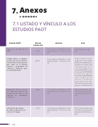 7. Anexos 7.1 LISTADO Y VÍNCULO A LOS ESTUDIOS PAOT Estudio PAOT Año de Autores Link realización Página de Internet de la PAOT 2014 Procuraduría Ambiental y del Ordenamiento Territorial del DF http://www.paot.org. mx/ Estudio sobre el régimen jurídico de la prevención y control de la contaminación por ruido en el Distrito Federal y propuestas de reforma y adiciones para su fortalecimiento 2013 Procuraduría Ambiental y del Ordenamiento Territorial del DF http://centro.paot. org.mx/index.php/ publicaciones-paot/16- estudios-tecnicos/1924- estudio-sobre-el- r%C3%A9gimen- jur%C3%ADdico-de- la-prevenci%C3%B3n- y-control-de-la- contaminaci%C3%B3n- -por-ruido-en-el- distrito-federal- y-propuestas-de- reforma-y-adiciones- para-su-fortalecimiento Evaluación de los niveles de ruido generados en el interior de la Línea 12 del Sistema de Transporte Colectivo 2013 Procuraduría Ambiental y del Ordenamiento Territorial del DF http://centro.paot.org. mx/documentos/paot/ estudios/EsPA-02-2013. pdf Informe de los niveles de ruido ambiental en el Centro de Tlalpan 2012 Procuraduría Ambiental y del Ordenamiento Territorial del DF http://centro.paot.org. mx/documentos/paot/ estudios/InPA-03-2012. pdf 158